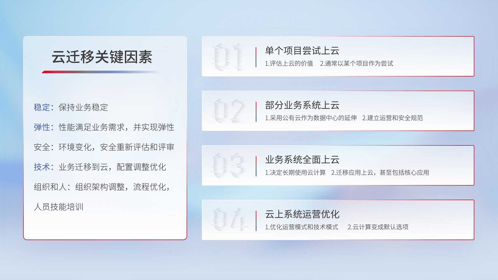 结合实际业务,,,从规划设计、、、云平台选型、、云原生改造、、数据迁移、、集成交付,,,迁移全过程为客户识别最佳上云路径,,,,做好风险识别管理,,设计网络架构、、、、身份权限、、安全审计合规、、、操作审计、、日志审计、、、监控告警策略、、、、多站点容灾设计等,,对云上基础设施进行整体规划,,,提升IT治理水平,,以满足弹性、、、高可用、、、高性能的需求。。